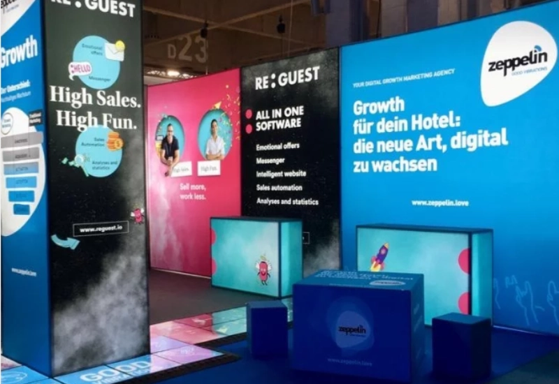 Hoe ziet een beursstand met professionele layout en prints eruit?